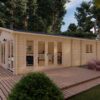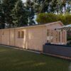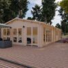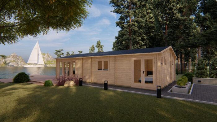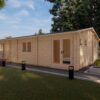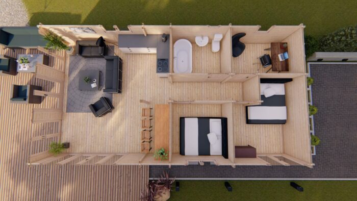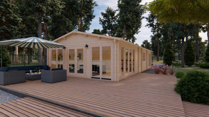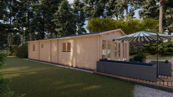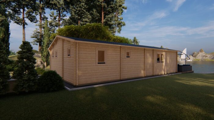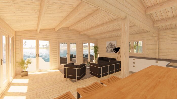 Tato chata je unikátní svým počtem otvorových prvků – devět oken různých formátů a sedm vchodů, včetně dominantního proskleného portálu o šířce 300 cm, vytváří interiér, který je v dokonalém spojení s okolní přírodou. Konstrukce z masivního roubeného hranolu (v tloušťce 44 mm nebo 68 mm) a možnost volby zesílené podlahy (28 mm) předurčují Býlničku k celoročnímu využití.