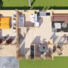 Dominantou přízemí je široký prosklený vstup (300 cm), který spolu s dalšími 11 okny s izolačním dvojsklem zajišťuje prosvětlení celého interiéru z mnoha stran. Venkovní prostor doplňuje integrovaná terasa o rozloze 15,2 m², ideální pro společné chvíle v přírodě.