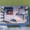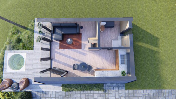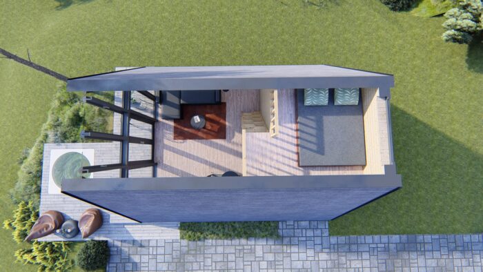 Výrazným prvkem Jelence je hluboký přesah střechy (1,3 m), který vytváří chráněnou zónu pro odpočinek na balkoně v patře i na terase v přízemí. Konstrukce s plochou střechy téměř 97 m² a použitím kvalitních 19mm střešních i podlahových desek garantuje stabilitu a odolnost celého objektu.