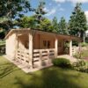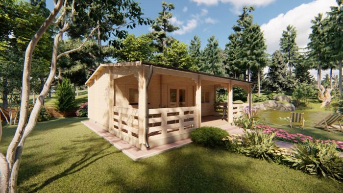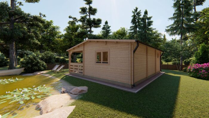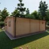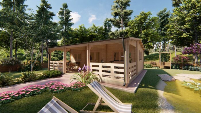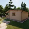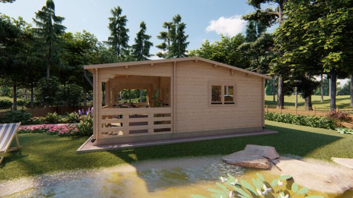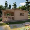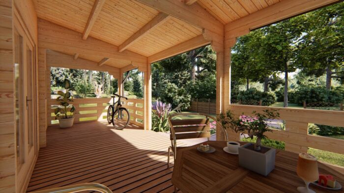 Výrazným prvkem tohoto modelu je velkorysá integrovaná terasa o rozloze 19,3 m², která slouží jako ideální prostor pro venkovní stolování a odpočinek. Se třemi vchody a čtyřmi okny s izolačním dvojsklem je chata skvěle přístupná a prosvětlená.