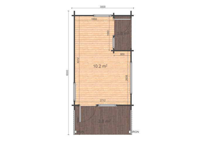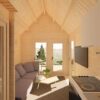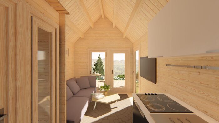 Dispozice je rozdělena do dvou místností, které doplňuje útulná terasa o rozloze 5,2 m², ideální pro chráněné venkovní posezení. Chata je osazena vysokými prosklenými prvky a dvěma dveřmi, což zajišťuje moderní vzhled a dostatek světla v celém interiéru.