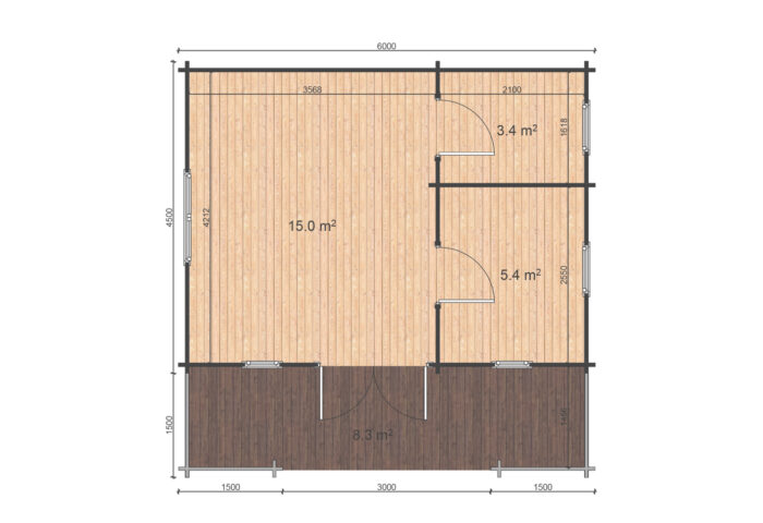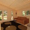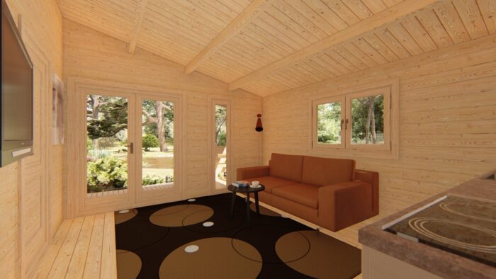 Interiér je prakticky rozdělen do tří samostatných místností, což umožňuje vytvořit plnohodnotné zázemí s oddělenými ložnicemi nebo sociálním zařízením. Se třemi samostatnými vchody a pěti okny s izolačním dvojsklem je chata mimořádně světlá a snadno přístupná. Konstrukce z 44mm masivního roubeného hranolu a vysoký hřeben střechy zajišťují stavbě stabilitu a vzdušnost.