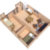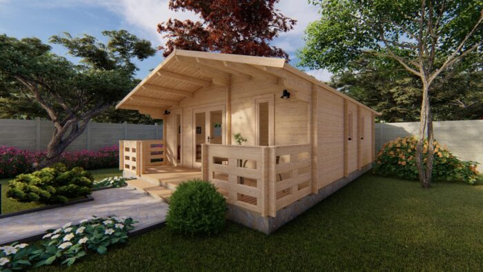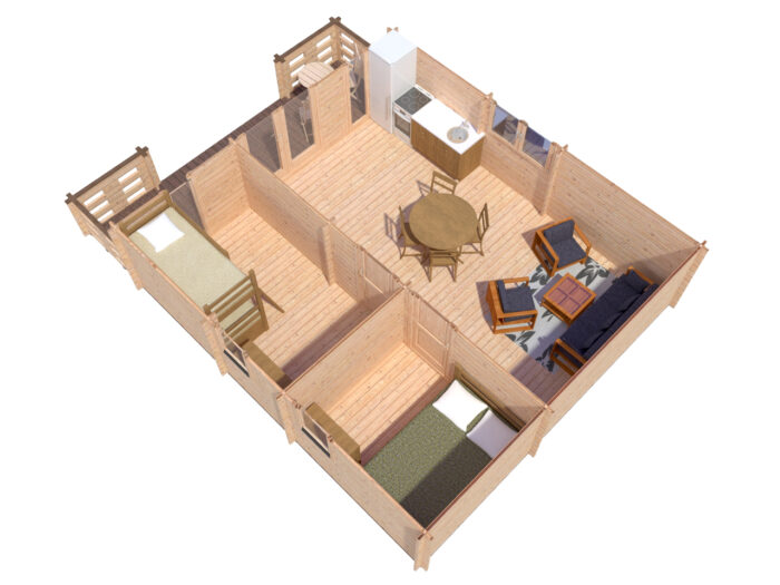 Dispozice je chytře rozdělena do tří pokojů, což umožňuje vytvořit komfortní obývací prostor i samostatné ložnice. Součástí konstrukce je také prostorná terasa o výměře 8,3 m², která slouží jako ideální místo pro kryté venkovní posezení. Chata je vybavena třemi samostatnými vchody a pěti okny s izolačním dvojsklem, což zaručuje plynulý provoz a vynikající světelnost celého interiéru.