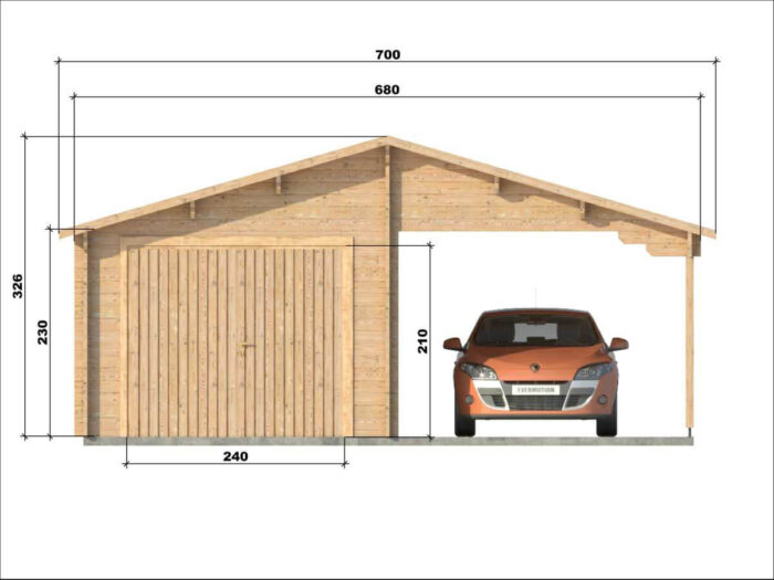 Model Garáž D s prístreškom je multifunkčná drevostavba, ktorá na zastavanej ploche 38,1 m² rozumne kombinuje uzavretý priestor pre automobil s praktickým bočným prístreškom.