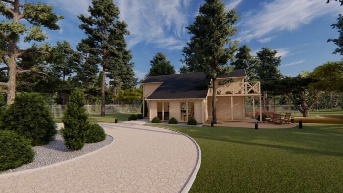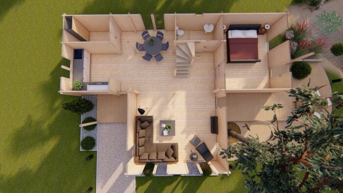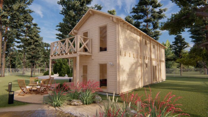Výnimočný komfort dopĺňa priestranná terasa (17,4 m²) a balkón na poschodí (12,5 m²), ktoré poskytujú ideálny priestor pre vonkajšiu relaxáciu. Interiér je presvetlený rekordným počtom 14 okien v rôznych formátoch, čo v kombinácii s masívnym 68 mm rúbeným hranolom vytvára zdravé a energeticky efektívne bývanie.