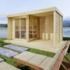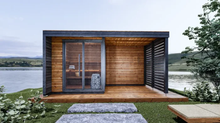 Sauna M predstavuje dokonalú kombináciu wellness zážitku a modernej záhradnej architektúry. Tento model vyniká premysleným rozdelením plochy, kde vnútorná saunová časť s rozlohou 4,4 m² plynule nadväzuje na priestrannú krytú terasu s plochou 9,8 m², ktorá slúži ako ideálna odpočiváreň po saunovaní.